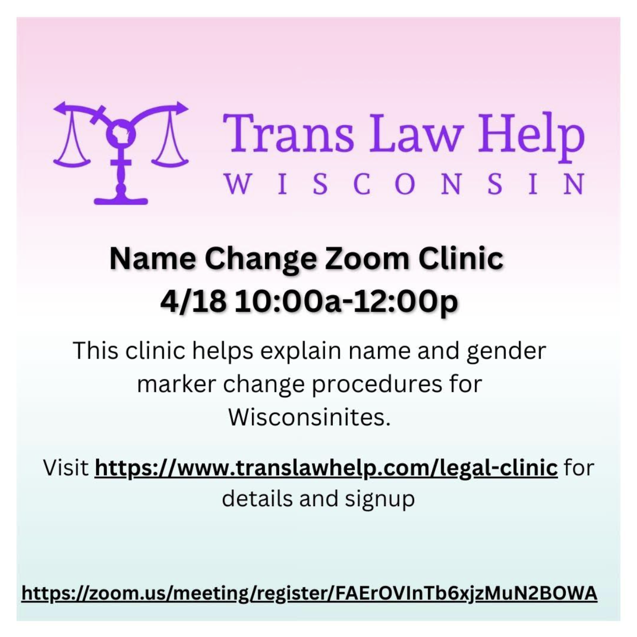 Trans Law Help Wisconsin, Inc. offers trusted legal information and resources to trans and nonbinary people in Wisconsin, centering access to name and gender marker changes and reducing individual barriers to affirmed identity.